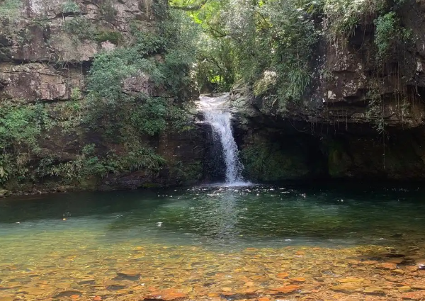 行至柘林瀑时,暮色已悄悄漫上山谷。瀑布虽不如雨季磅礴,却多了几分清灵,水流从赭红色的岩石上倾泻而下,在潭面溅起细碎的水花。